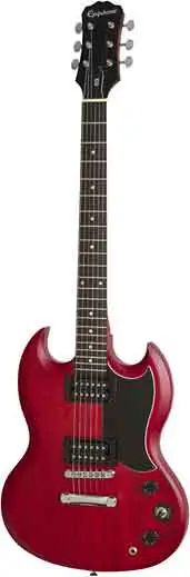 The Epiphone SG Special VE is a great version of the SG for beginner guitar players, especially for beginning ladies who may find the more expensive Gibson models to be much heavier. The VE has a poplar body and an Okoume neck – both of which are lighter than the mahogany used on other models.