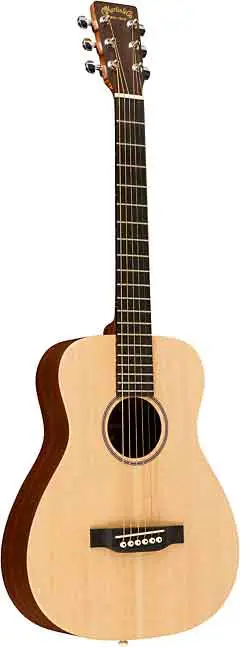 The “Little Martin” is a guitar that could be considered either a Parlour guitar or Single-0. Martin describes it as a “modified 0-14 fret”, so the neck and body intersect at the 14th fret. The fingerboard width at the nut is measured at 1-11/16”, so playing chords in the standard open position will be very comfortable for smaller hands. Scale length is a bit shorter than the Taylor Mini at 23”.