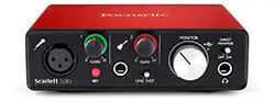 The Focusrite Scarlett Solo is arguably the most popular in the world for this, and with good reason. It lets you plug in a microphone, a guitar, or even both if you plan to do a combination of guitar plus talking or singing. The Scarlett Solo doesn’t cost an excessive amount (check the price here at Amazon) and can simply ‘plug and play’. Your software should recognize it very quickly after it has been plugged into your computer via USB and you’ll be ready to go.